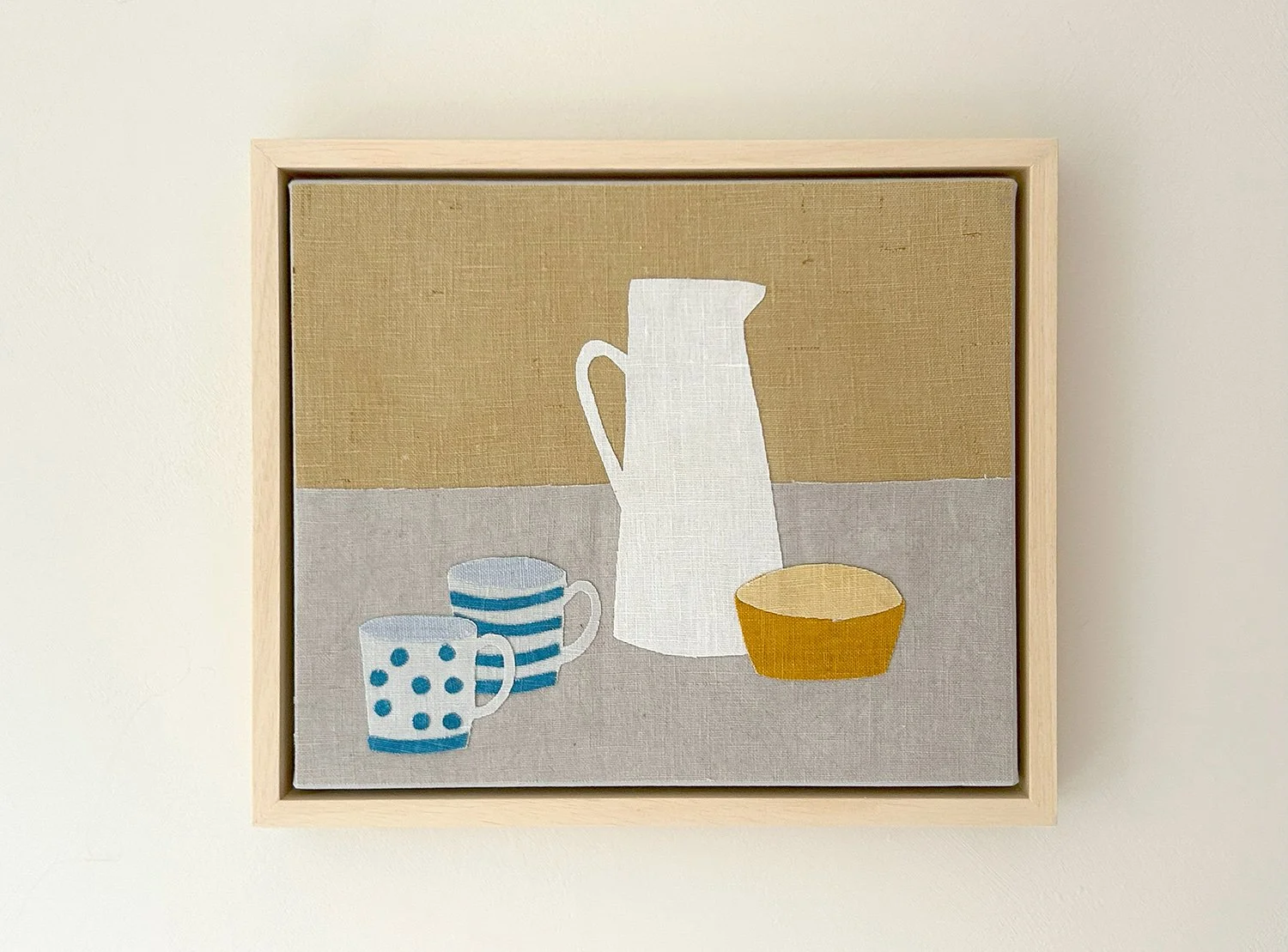 Slide 1 Slide 1 (current slide) Slide 2 Slide 2 (current slide) Jug and Two Mugs (sold) Fabric: Irish LinenDyes: Indigo, Nettle, Weld, Marigold, Black TeaDimensions: 10 x 12 inches£350
